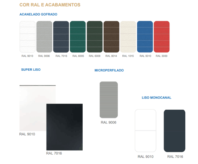 Os nossos portões seccionados poderão ser fabricados com as seguintes características: portão com chapa super lisa, chapa acanelada gofrada, microperfilada e lisa monocanal.